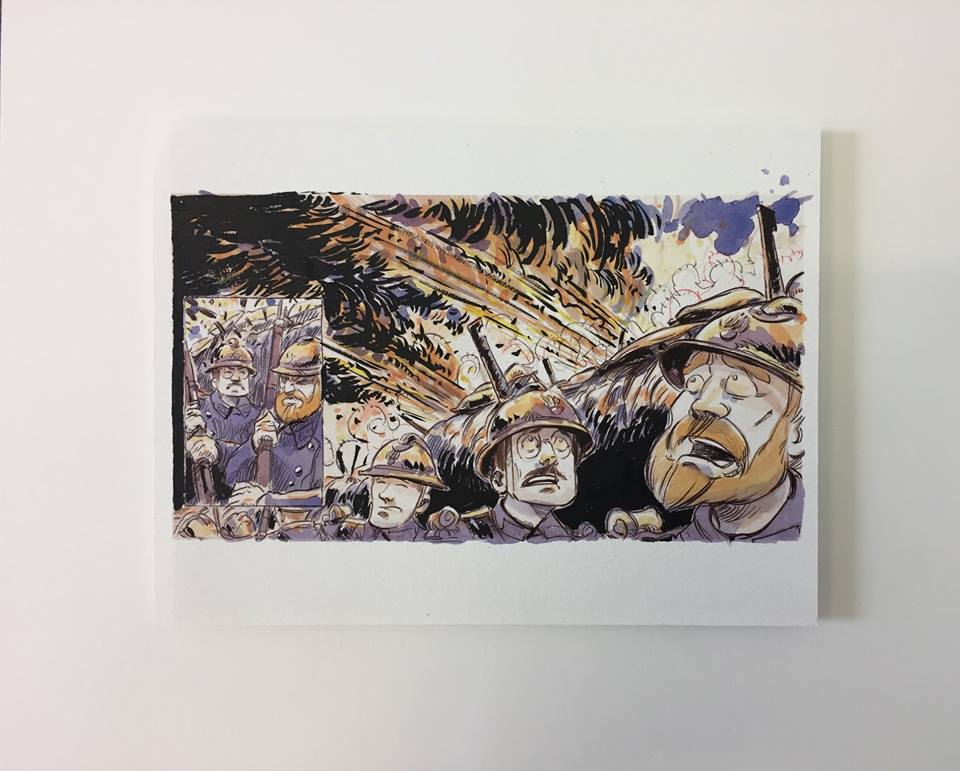 "Gallerist Olivier Cornet met graphic artist Leyho in the summer of 2017 when they were working on the Drawing on Joyce project for the Bloomsday Festival. They discovered that their French great grand uncles had been on active service in the First World War. Both had documented it. Olivier’s great grand uncle Francois Bost had been a war photographer while Leyho’s great grand uncle Francis Régeard had carried notebooks with him in the trenches.Francois’s photo album and Francis’s notebook pose as many questions as they answer. Together, they reveal the chaotic horror of the war machine, far from glamourized or propagandistic representations. When he was a young child, Olivier Cornet remembers first seeing the pictures that his great grand uncle took during the First World War. "I saw his aerial photographs as a kid and they just looked beautiful to me," says Cornet. For Leyho, Bost’s photos offered visual fragments, unedited jigsaw pieces, to inspire his “Chiens Bleus, Chiens Gris” bande-desinée project. These bleached out photos capture the immediacy of the battlefield, far from black and white nostalgic representations. Leyho says “One can legitimately wonder how to put into images the incredible period that was the First World War. It has been so well documented, photographed, and even filmed. Every person has a definite trace in memory, a strong mental image. So much so that one can speak of "collective imagination". Discovering Bost’s photos, and discussing with Olivier the commonality of their ancestor’s experience, helped Leyho imagine his graphic interpretation. Leyho continues “The term imagination is essential because it highlights that, of all that could be lived during these battles, no one today bore witness to the reality of them. We can only imagine it, theorize it and maybe even fantasize it. We cannot know it. It is with this point of view that I drew and coloured this story. I sought to give an impression, emotions, rather showing the photographic truth.”Leyho was also inspired by ‘Aftermath, the war landscapes of William Orpen’, an exhibition held at the National Gallery of Ireland in 2017. Orpen’s sketch books, his bleached landscapes, his trench-eye view of the traumas of war, fed Leyho’s interpretation of his great grand uncle’s story. Leyho says “To tell such a story, I think you need to go deep down into the imagination of a soldier in his twenties, upset by a profound cataclysm that no one should experience.”For Cornet, it was the tangibility of his great grand uncle’s photo album that made war real to him. Recalling his childhood, Olivier said that he experienced Bost’s photos in glorious technicolour. François Bost used his camera to capture the reality of the first World War, the so-called War to End All Wars. He didn't know that his images would, a century into the future, join forces with Francis Régeard’s notebook and the art of William Orpen to inspire the 9th art of Chiens Bleus, Chiens Gris."Jessica Peel-Yates, June 2018