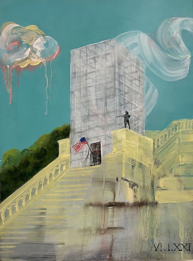 This timely exhibition – Augmented Auguries - brings together an ambitious body of Claire’s work developed over the last two years building on themes and concepts previously explored in her paintings. Responding to sites of conflict and contested histories internationally from the Pandemic, storming of the Capitol, to the war in Ukraine, now Claire turns her lens to national conflict and protest in Northern Ireland. The spectacle and theatrics of conflict and protest are documented and recorded through paint. The works attempt to navigate the complexity of the contemporary theatre of war and cultural wars as battlefields move to the battlespace of the online and livefeed of news, images and social media. All played out in the steady stream of content, real, fake and created by whom for whom and for what intent and future consequences in writing history.