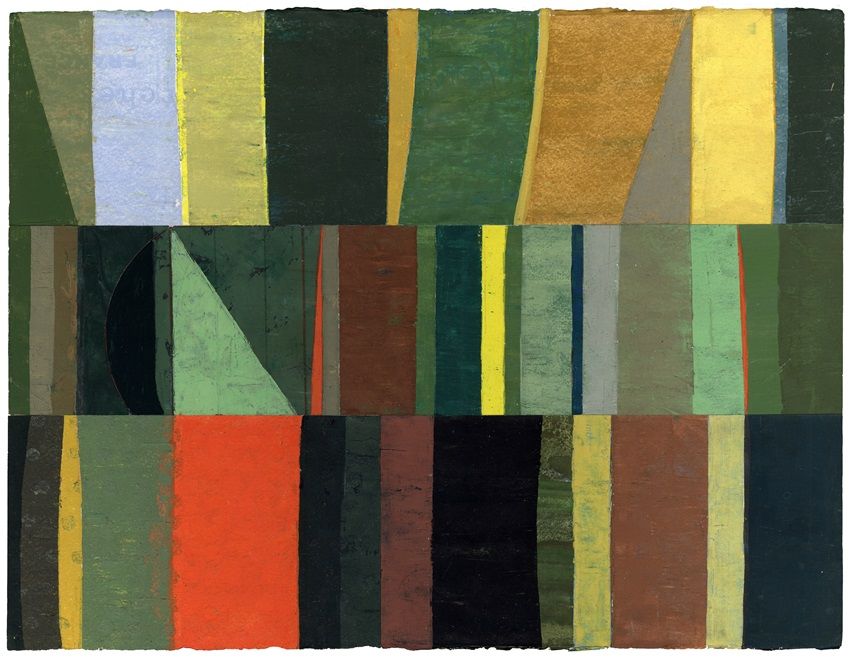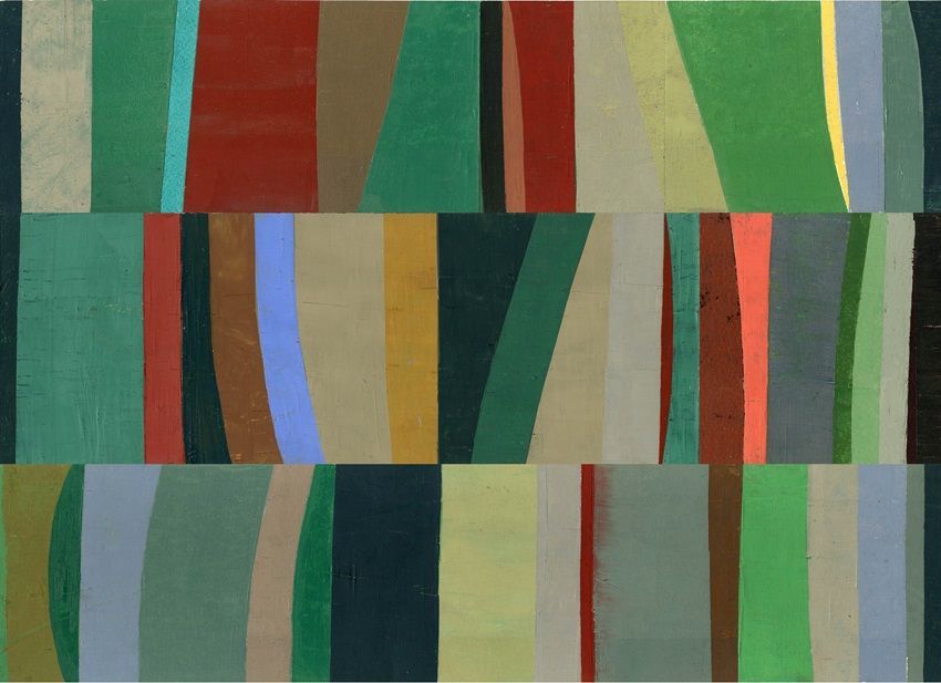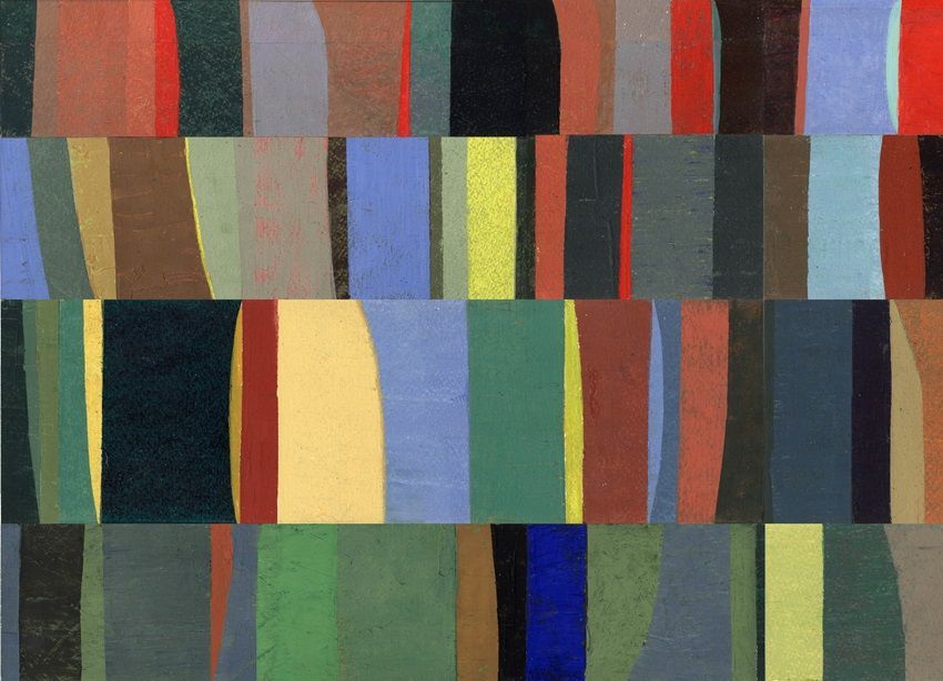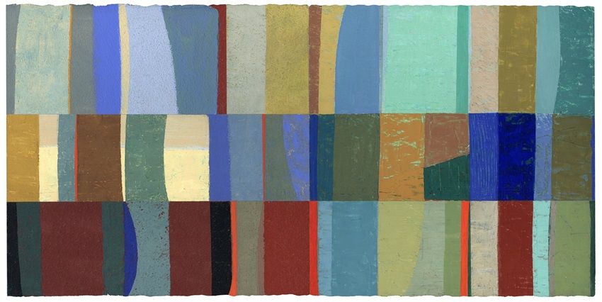 The process is studio based, mainly involving oil or egg/oil tempera on traditional supports such as hand-made papers, gesso panels and stretched canvas. I use brushes but more often employ scrapers to spread and layer paint. A preferred medium is tempera paint which dries quickly with its own characteristic matt luminosity. This permits the build-up of translucent layers to attain depth, vibrancy and resonance. Some pieces develop or evolve within the area of a single support while other compositions begin as motifs, painted on smaller off-cuts of paper, panels or canvases.