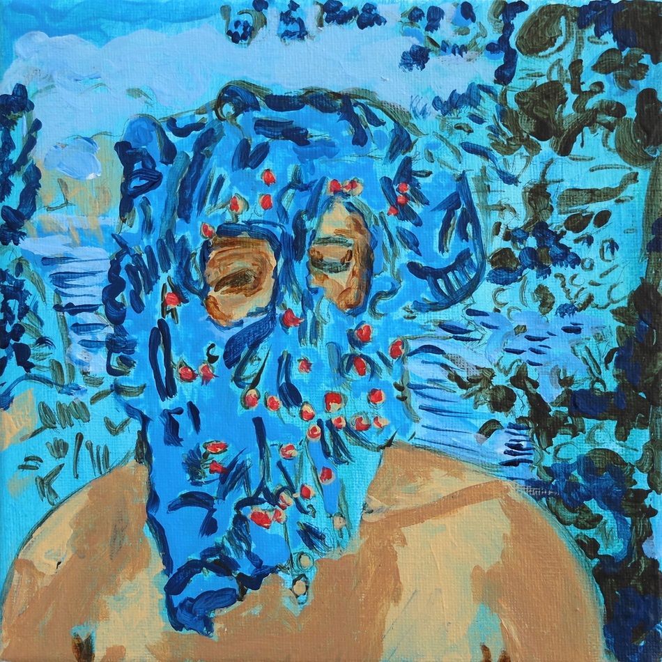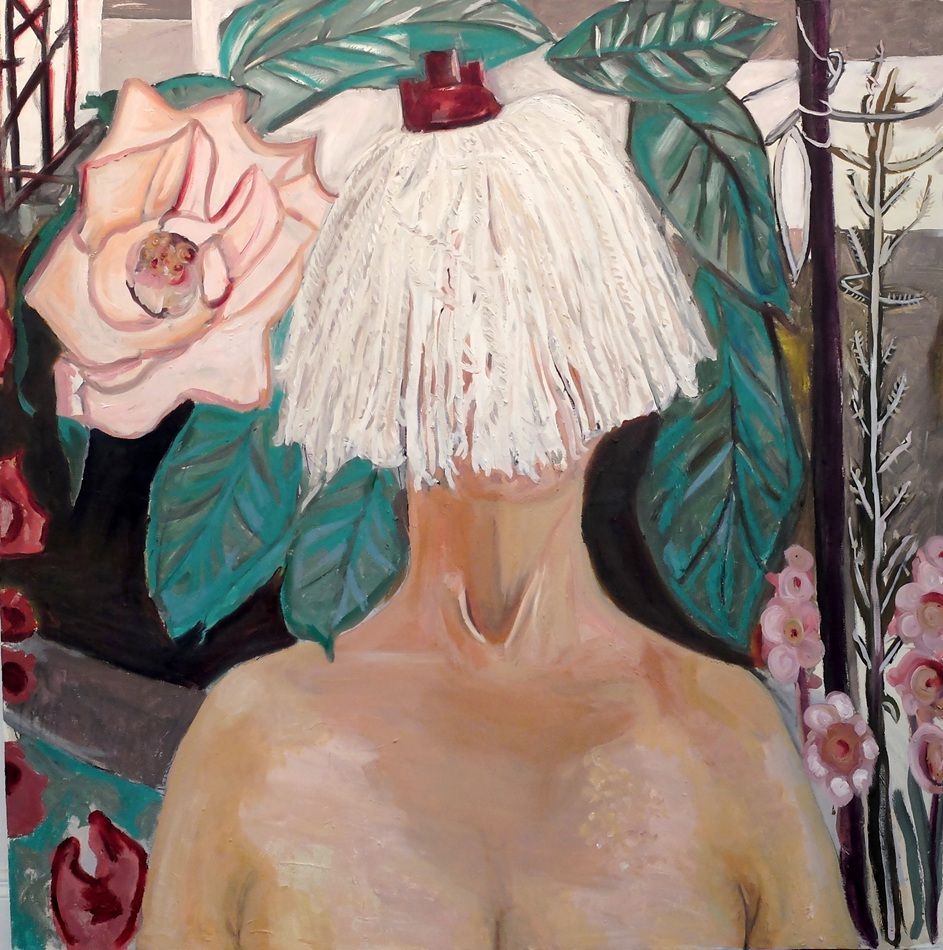 "Vicky Smith’s self-portraits – faces concealed by an object each time – were painted during her first four years of motherhood. They explore, in scholar Phillina Sun’s words, “a sense of self-transformed by a time of intense change and adaptation to the needs of an entirely new human being”.