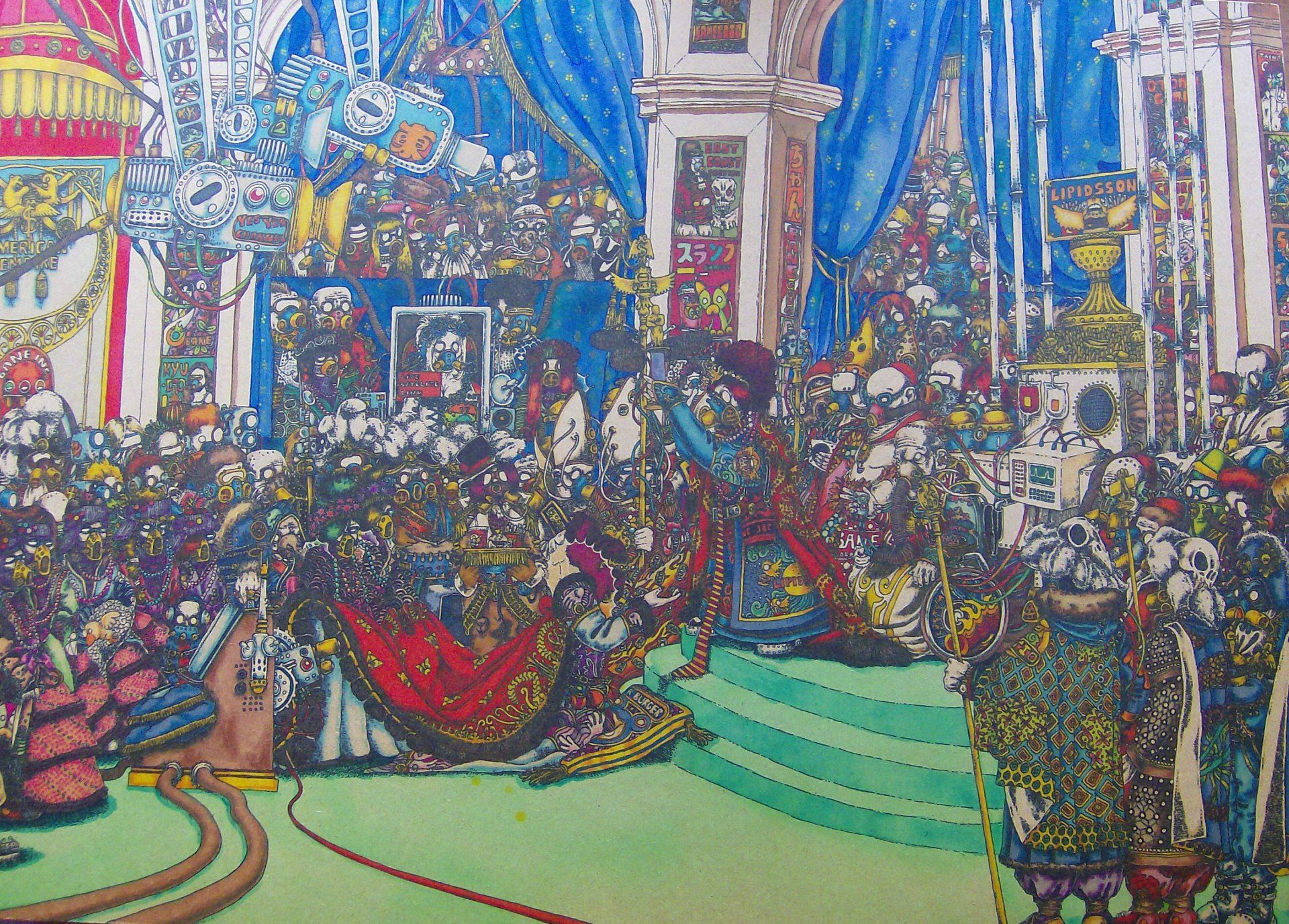 Using imagery drawn from both historical sources and contemporary media, this darkly humorous world holds up a distorted mirror to our own and invites us to laugh at ourselves.