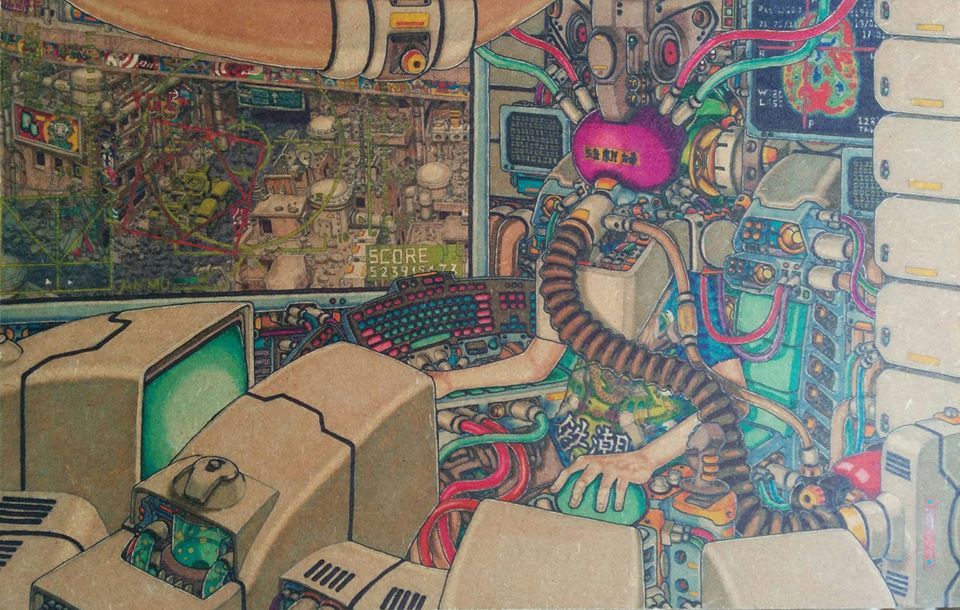 The two artists exchanged uncompleted works for the other one to finish and possibly produce some magic answers or re-feed their systems. At the time of writing I have still not seen the outcomes and I am left wondering how Mark’s sharp line, detailed equipment, supervision engineering, mythologies, use of language and signs will play out along with the shyly declared individuality of Kelly’s characters. It’d be like letting an outsider into a Lanthimos film.
