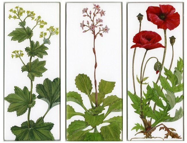 Each painting is 21cm x 8.5cm on 4mm glass and involves acid etching, drawing, painting and gilding in the technique of Verre Eglomisé. The back of each panel is gilded to cast a glow behind the plant, emphasising its preciousness, making that which is considered common more exquisite. The paintings are presented in groups of three reflecting the season, their habitat or their relationship with each other, capturing their delightful vivacity.
