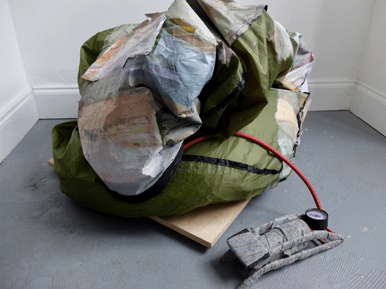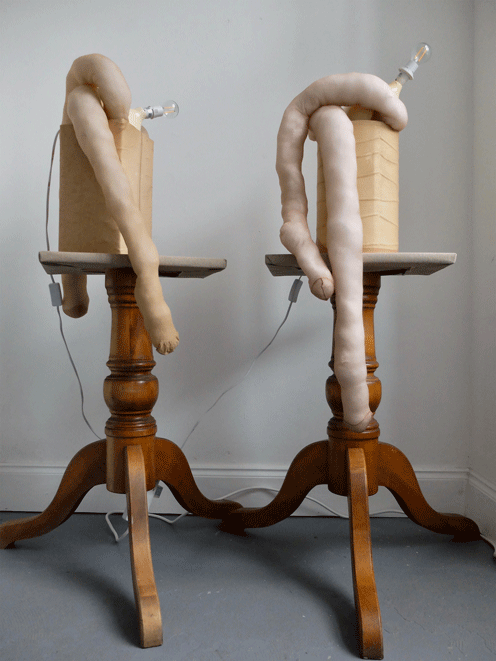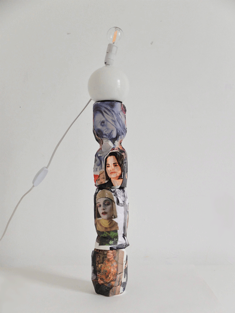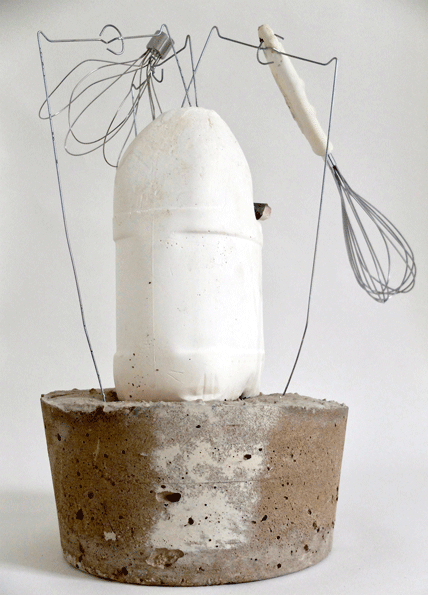 Among the experimental surrealist sculptures are appropriated domestic objects, a fabric figure made from a found green air couch, an electric blanket with a portrait stitched on the front, a medical magnifying light, an hourglass figure cutout and foam-filled nylons that represent knobbly knees, a milk bottle plaster cast with a whisk that no longer whisks and metal wires, a plaster cast tower of collaged news photographs, bedside table lights and an iron that has become stuck in a bucket of cement. The news photograph of a young woman with brown hair collaged onto the front of the iron is a survivor of a catastrophic event, whose neck and face bear physical scars from this attack. The hourglass cutout represents the artist's legs cut from the waist down, symbolising a recurring nightmare the artist had in which she could not raise her head in a crowded room and only saw people's legs and feet. Her dream resonates with Plath’s story “Mary Ventura and the Ninth Kingdom”: acknowledging that conventional gender norms constrain and repress women, Smith suggests that women, like Mary Ventura, should opt out and imagine an alternative, even utopian society.