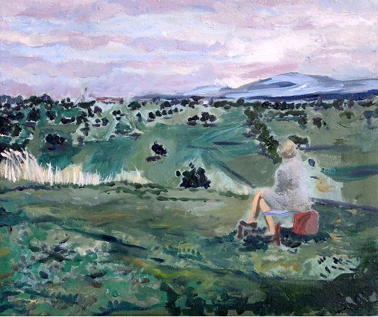 Smith paints female portraits and female figures in an imagined landscape which revisits her grandfather’s archive of photographs and slides depicting notable places in Ireland: Maam Valley, Lake Inagh, Galway Cathedral, Inish Turk, Lakes of Killarney, Lough Corrib, Leenane, Adare, Doolin, the road to Clifden, Kylemore Abbey, and Maam Bridge. These repurposed landscapes delineate a new kingdom, inspired by Sylvia Plath’s short story “Mary Ventura and the Ninth Kingdom”, written not long after she had left home, which Plath described as “the story of a teen-age girl who passes through the temptation of the material world, grows aware of her own idealism and power to help others, and discovers the City of God”. This symbolic tale, a learning story, grapples with our recurring change in motion. Some artists write, paint or make work to figure out this change and what kind of artist or being they want to be. Two paintings based on the artist's mother and grandmother represent powerful matriarchal leaders of this female utopia, symbolising perseverance in the face of adversity.